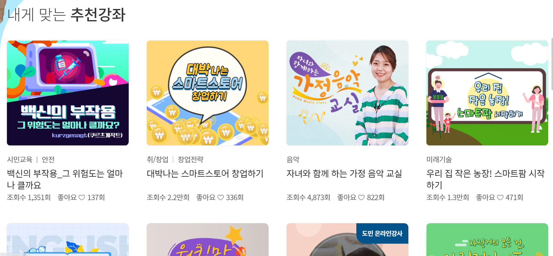 경기도 지식 사이트에서 가장 많이 이용하는 서비스가 바로 온라인학습입니다. IT, 외국어, 자기개발, 취미, 인문 등 다양한 카테고리에서 강좌가 준비되어 있습니다. 최근 뜨고 있는 스마트스토어부터 반려동물, 요리 등 다양한 콘텐츠가 있으니 아래 메뉴에서 확인해보세요.
