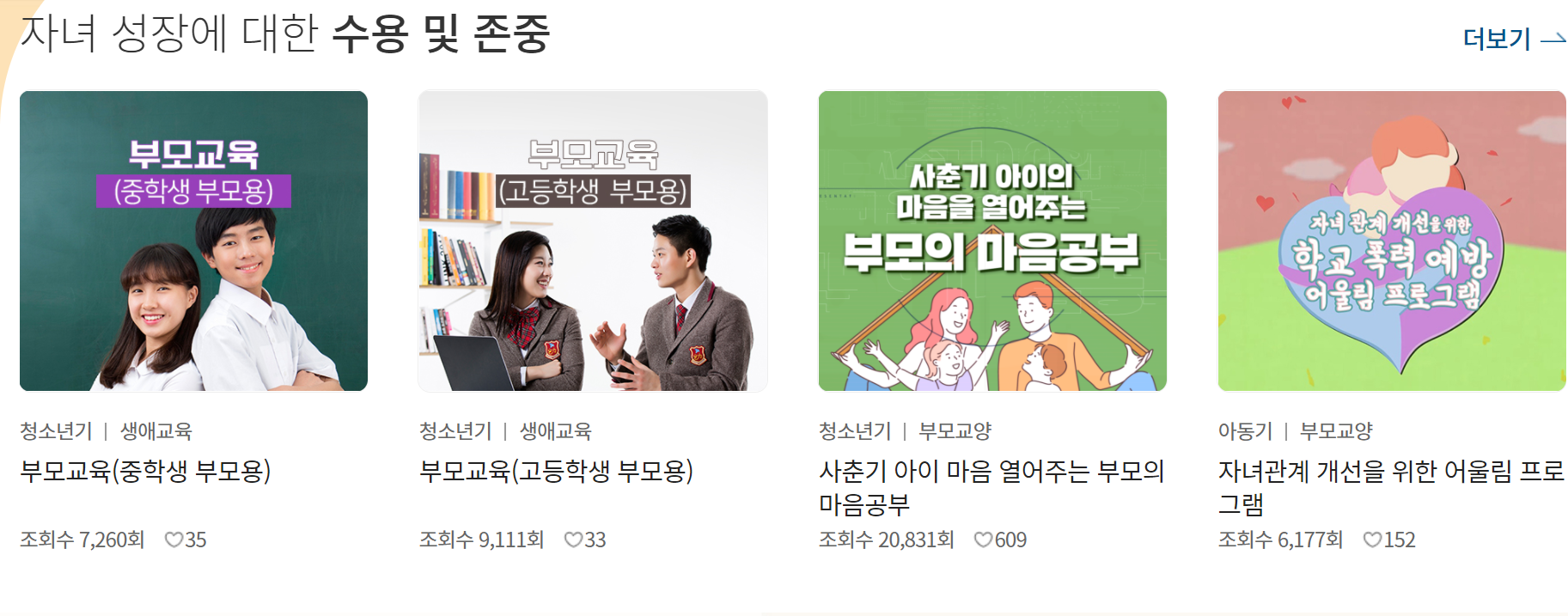 자녀가 성장하는 생애단계별로 필요한 학습에 대해 배울 수 있는 곳입니다. 예비부모, 영유아기, 아동기, 청소년기, 부모-자녀관계 진단 서비스를 제공하니 꼭 활용해보시기 바랍니다.