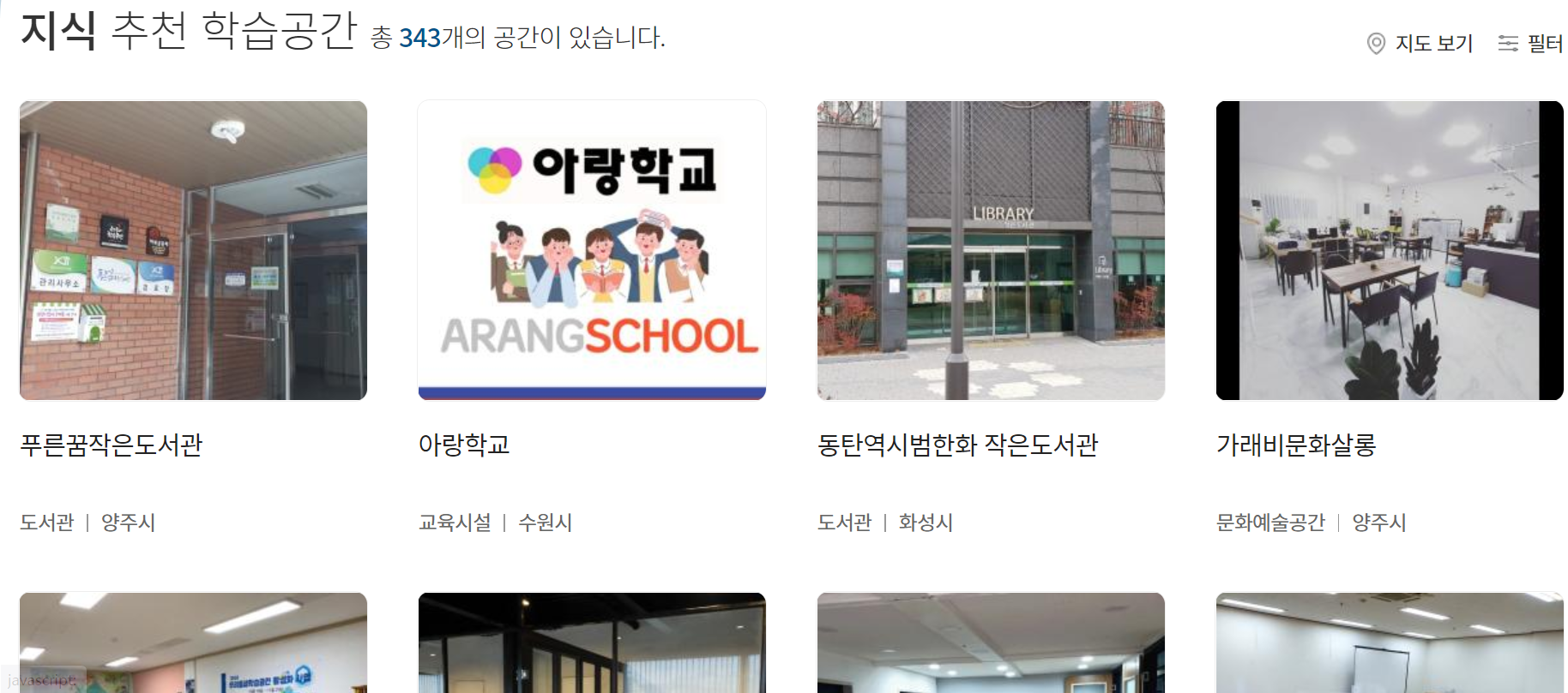 학습공간을 예악할 수 있는 서비스도 제공합니다. 원하는 지역이나 날짜를 선택하면 가능한 장소가 조회됩니다. 해당 장소의 위치, 이용시간, 수용인원, 대여장비 등의 정보를 자세히 안내받을 수 있습니다.